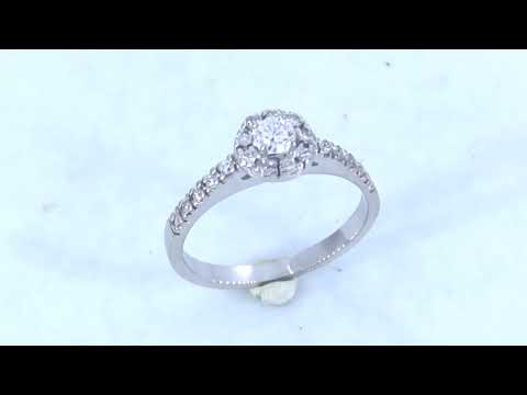 Anillo de compromiso fabricado en oro de 14k, diamante natural de 0.30 quilates de peso, grado de color G/H, claridad SI, corte brillante, mide 4.3 mm de diámetro, 10 diamantes laterales y alrededor del diamante central.